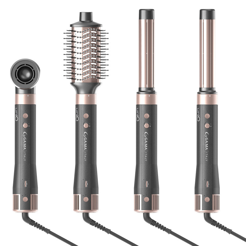 Multistyler UNIQ AURA 4 IN 1 spazzola ovale da 60 mm due arricciacapelli destro e sinistro da 32 mm. Include filtro estraibile, sistema di blocco accessori e cavo girevole per un uso comodo e sicuro.